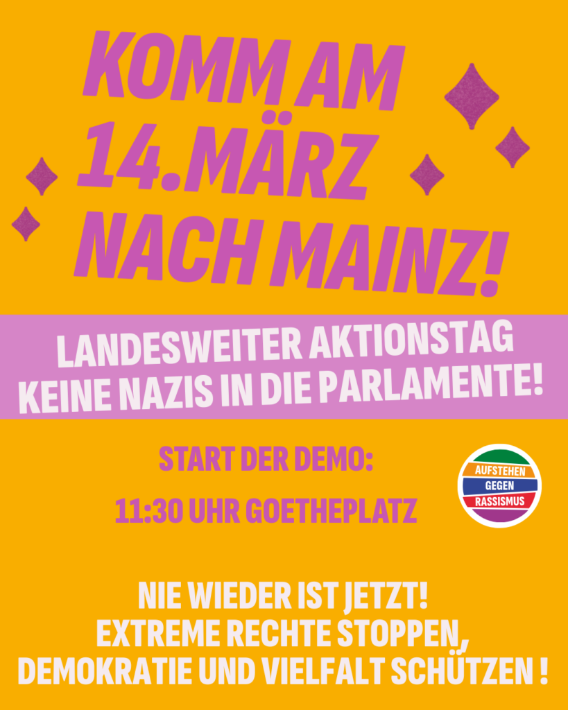 Jetzt Flyer bestellen und alle eure Veranstaltungen gegen die AfD und andere Nazis in Rheinland-Pfalz bis zur Landtagwahl hier auf die Homepage stellen: https://www.aufstehen-gegen-rassismus.de/ltw-26-rlp