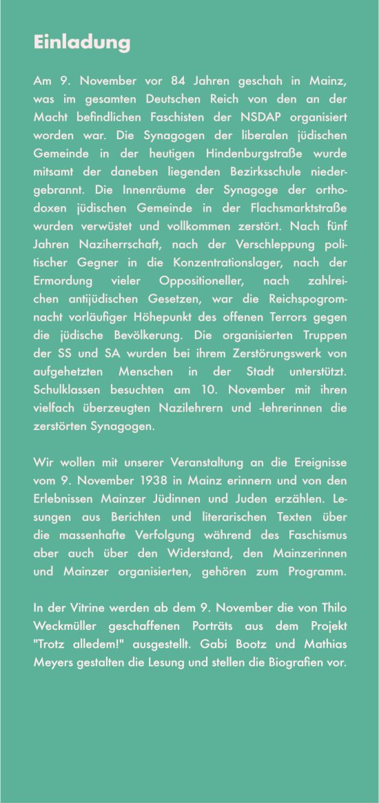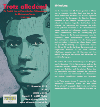 Anlässlich des Jahrestages der Reichpogromnacht wird ein Teil der Ausstellung ‚Trotz alldedem‘ mit Portraits aus dem antifaschistischen Widerstand aus dem Rhein-Main-Gebiet in der Galerie ‚Vitrine‘ in der Klarastraße 5, 55116 Mainz zu sehen sein.