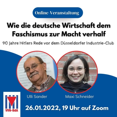 Die Veranstaltung wird auf Zoom stattfinden und auf Facebook live übertragen werden. Der Zoom-Link folgt in Kürze auf unserer Webseite: https://vvn-bda.de/wie-die-deutsche-wirtschaft-dem-faschismus-zur-macht-verhalf-online-veranstaltung-am-26-01-19-uhr/