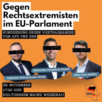 Am 09.11. findet im Kulturheim in Mainz Weisenau um 19:00 Uhr ein Vortragsabend der ESN-Fraktion im EU-Parlament mit Alexander Jungbluth, René Aust und Sebastian Münzenmaier von der AfD statt. Thema soll: „35 Jahre Mauerfall: Ein bedeutender Tag für Deutschland & Europa“ sein.