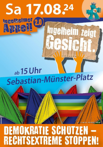 Aus der Ankündigung: „Für den 17. August 2024 haben rechtsextreme Gruppen erneut einen Aufmarsch in unserer Stadt Ingelheim angekündigt. Wir wollen keinen Rechtsextremismus in Ingelheim – weder in unsrem Stadtparlament, noch auf unseren Straßen. Für den 17. August ruft daher ein Buntes Bündnis zum demokratischen Gegenprotest gegen den Naziaufmarsch in Form einer bunter Versammlung auf dem Sebastian-Münster-Platz auf. Wir hoffen, dass möglichst viele Menschen an diesem Tag ein aktiver Teil des Bunten Aktionsbündnisses gegen Rechtsextremismus sein werden. Darüber hinaus können vor allem die, deren Wohnungen, Büros, Geschäfte und Gaststätten in der Nähe des Bahnhofs beziehungsweise an den bisherigen Aufmarschstrecken liegen, diese Situation nutzen: Zeigen wir gemeinsam den Nazis aus der rechtsextremen Ecke, dass unser Ingelheim bunt, tolerant und demokratisch ist. Malt Banner, besorgt euch Fahnen und hängt sie aus den Fenstern oder von den Balkonen! Beschallt die Straßen mit eurer Musik! Werdet kreativ, passt auf euch auf und bezieht Stellung! Wenn ihr Unterstützung oder Anregungen wünscht wendet euch an kontakt@in-rage.org“